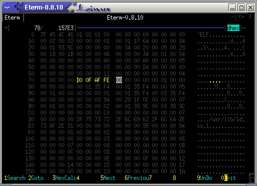 DHEX is a more than just another hex editor: It includes a diff mode, which can be used to easily and conveniently compare two binary files. Since it is based on ncurses and is themeable, it can run on any number of systems and scenarios. With its utilization of search logs, it is possible to track changes in different iterations of files easily. Please send me any themes you made! (please include DHEX in the header) Or just download some themes from here. It is known to run on Linux, HP-UX, FreeBSD, NetBSD, MacOS X, IRIX and Solaris Join the facebook group Download the latest version here Version 0.69 (19-jan-2019)Download Version 0.69 here (MD5sum: 64d557437fe110c19f23ed3e9bbcdd54)Some users have been persistent, and convinced me to release a new version. Thank you so much for that. This will be the latest update for the DHEX 0.6x branch. Version 0.68 (09-sep-2012)Download Version 0.68 here (MD5sum: 5109b3d50053553e41d75c8e5c0a0175)Christof was awesome enough to send me a small bugfix. Apparently, under certain circumstances, opening a file could crash the program. His fix prevents this. Version 0.67 (14-may-2012)Download Version 0.67 here (MD5sum: 46d24d11b6e389509fff07404aedabb6)To make working with partial memdumps easier, it is now possible to set a sort of "base address" when loading a file. Thank you Thomas for suggesting this. Version 0.66 (21-feb-2012)Download Version 0.66 here (MD5sum: 304a91cfd9481b2ddf418f3a943190e1)Thanks to Atl, this version adds the ability to search for quoted strings, rather than just single words, from the command line. Additionally, thanks to Simon, it is now possible to set the color of the headers from the .dhexrc file. Version 0.65 (14-feb-2011)Download Version 0.65 here (MD5sum: 2d4ee5cc0cd95da5a1c7630b971e986d)Version 0.64 crashes at startup on some systems. My deepest apologies. Version 0.64 (12-feb-2011)DO NOT Download Version 0.64 here (MD5sum: 1e233ca05fc7b14cfd4135aa208dd420)This version comes with a naive correlator. It could help to match an object-file to the executable and compare it, for example. Moreover, there is a new default theme. Version 0.63 (29-jan-2011)Download Version 0.63 here (MD5sum: 0ce7bd3318fc90dc5251660229d1e2d6)This version comes with manpages. I'd like to take this opportunity and put out a call for themes. Version 0.62 (12-jan-2011)Download Version 0.62 here (MD5sum: 94024a8a43d88c85e9a035a19cb01d8d)Version 0.61 (08-jan-2011)Download Version 0.61 here (MD5sum: 9e4c5d3dda61d0d8ede49338da65d860)Version 0.60 (30-dec-2010)Download Version 0.60 here (MD5sum: e0e88f166d096d5316b9d5acf14465c1)![]() Version 0.55 (19-jan-2007)Download Version 0.55 here (MD5sum: 8331d8651e882062bc9f62fe6031ba45)Version 0.54 (19-jun-2004)Download Version 0.54 here (MD5sum: 242e6956d98b1672719248878099ab98)Version 0.53 (15-mar-2004)Download Version 0.53 here (MD5sum: b273c57d44806e6ccaefa04cea549b65)Version 0.52 (12-mar-2004)Download Version 0.52 here (MD5sum: 8c23cf748adf1caa02c25afbb6c55319)Version 0.51 (08-mar-2004)![]() Download Version 0.51 here (MD5sum: 98512d613b9339927e4618fa1c835aec) Screenshots- DHEX on Mac OS X (thanks to Thane Norton)- DHEX on four different operating systems. Linux (top left), NetBSD (top right), Solaris (bottom left) and FreeBSD (bottom right) - The Editmode - The diffmode - The diffmode on IRIX |